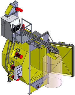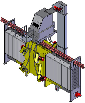 For all-round, automatic shotblasting of individual workpieces or those attached to a transport rack in batch processing by means of blast wheel technology. Attachment occurs on an overhead monorail system with carriage or lifting gear. The cluster of workpieces rotates and oscillates in the blast area during the blasting process.