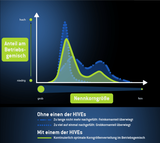Eine der Grundlagen für ein reproduzierbares Strahlergebnis ist ein konstantes Betriebsgemisch aus verschieden großen Strahlmittelkörnern mit optimaler Korngrößenverteilung zwischen der Neukorngröße und der im Abscheider eingestellten Trennkorngröße.